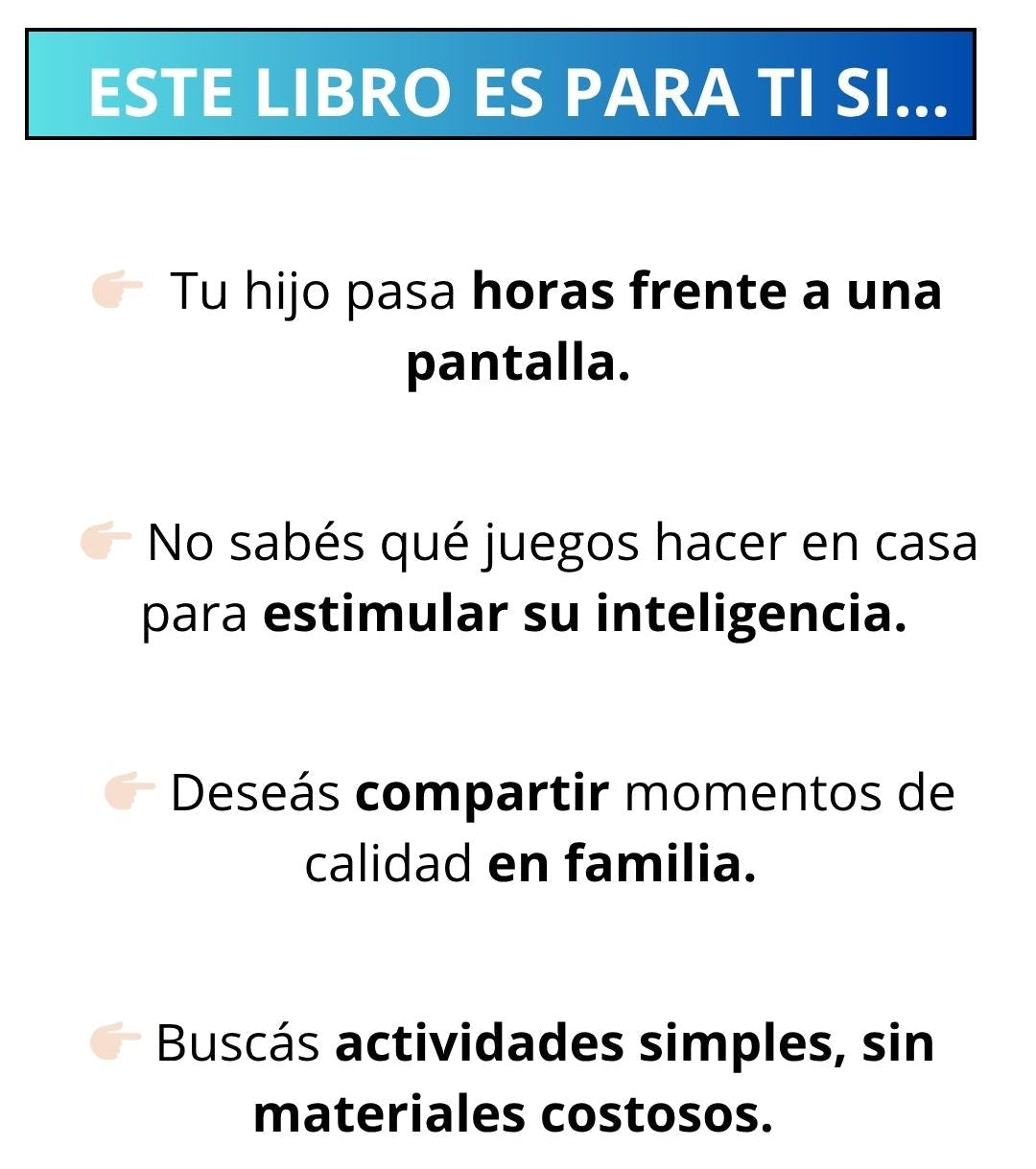 ⏳ Tranquila/o, no pasa nada. El libro está pensado para que lo uses a tu ritmo. 5 minutos jugando con tu hijo hoy, valen más que 0 minutos esperando el “momento perfecto”.